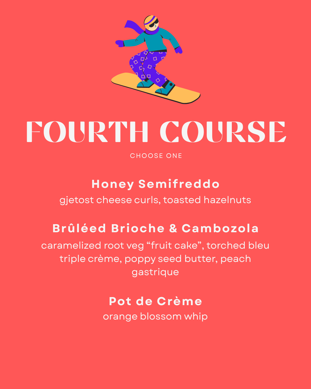 Four course dinner menu with optional drink pairings.